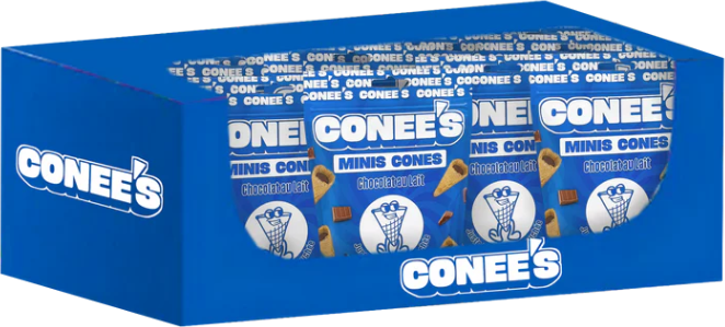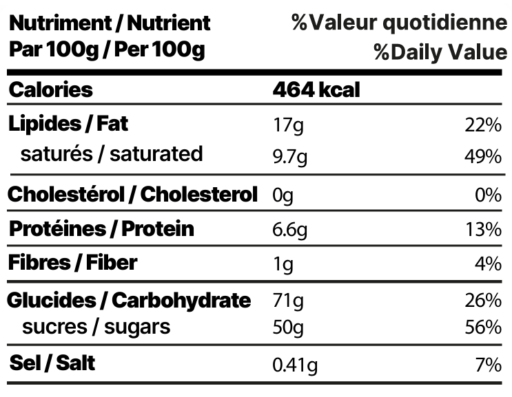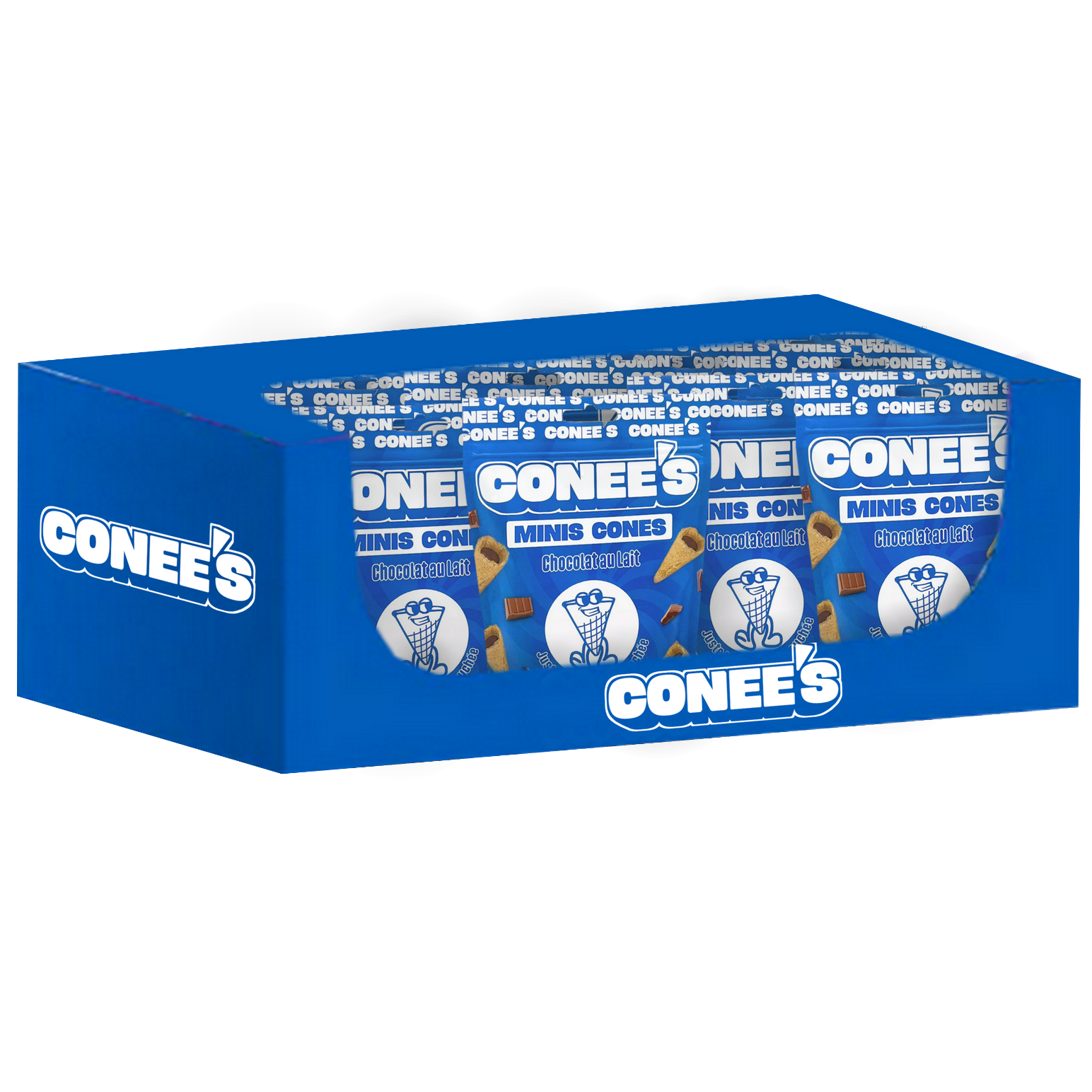 Chocolat au lait (60 %) [sucre, beurre de cacao, lait entier en poudre, poudre de lactosérum (lait), masse de cacao, lait écrémé en poudre, émulsifiant (phosphatides d’ammonium, polyglycérol polyricinoléate), arôme (vanilline)], Cornet (40 %) [farine de blé (gluten), sucre, émulsifiant (lécithine de soja), huile végétale (palme), colorant (caramel au sulfite d’ammonium (E150d)), sel, arôme (vanilline), eau].