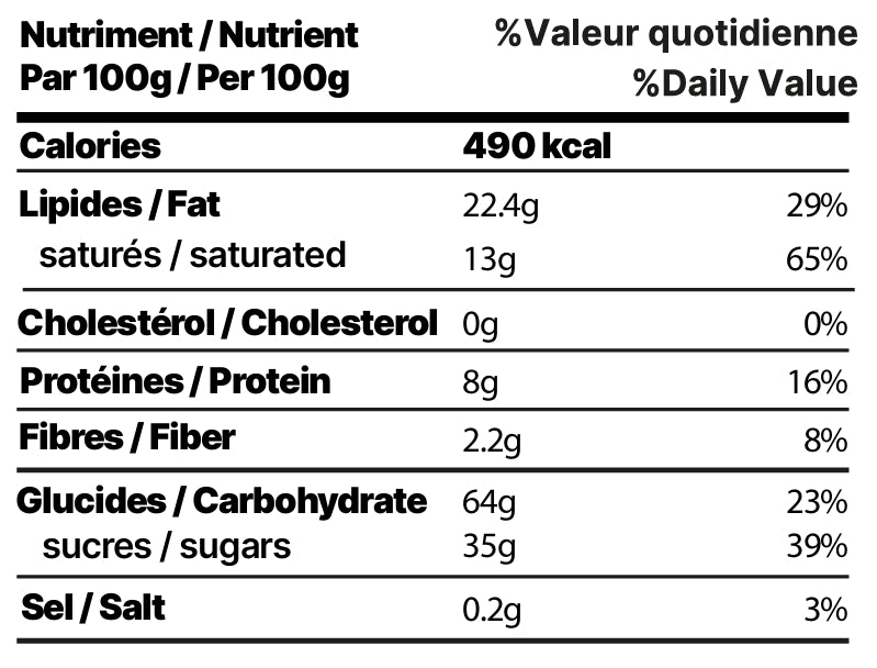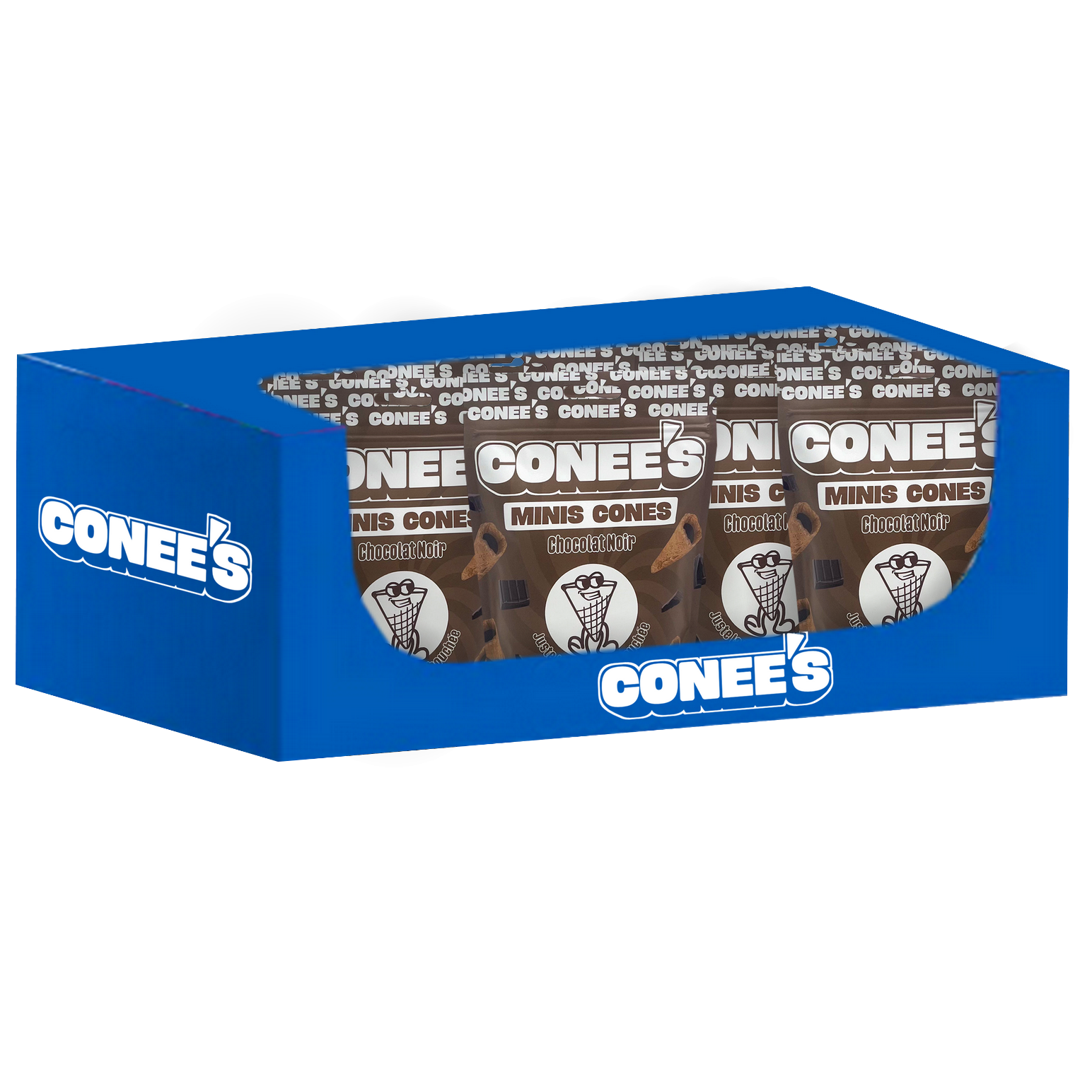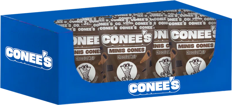 Chocolat noir (60 %) [sucre, masse de cacao, beurre de cacao, émulsifiant (lécithine de tournesol, polyglycérol polyricinoléate), arôme (vanilline)], Cornet (40 %) [farine de blé (gluten), sucre, émulsifiant (lécithine de soja), huile végétale (palme), colorant (caramel au sulfite d’ammonium (E150d)), sel, arôme (vanilline)].
